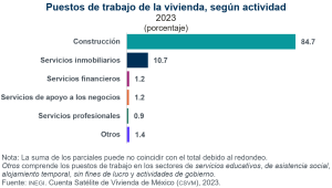 En 2023, las actividades económicas del sector vivienda generaron 2 millones 185 mil 532 puestos de trabajo, cantidad que representó 5.4 % del total nacional. De esta cantidad, y de acuerdo con el SCIAN, 84.7 % de los puestos de trabajo estuvieron involucrados en actividades de construcción; 10.7 %, en los servicios inmobiliarios; 1.2 %, en servicios financieros; 1.2 %, en servicios de apoyo a los negocios y 0.9 %, en los servicios profesionales. La participación restante de 1.4 % la aportaron otras actividades relacionadas con la vivienda.