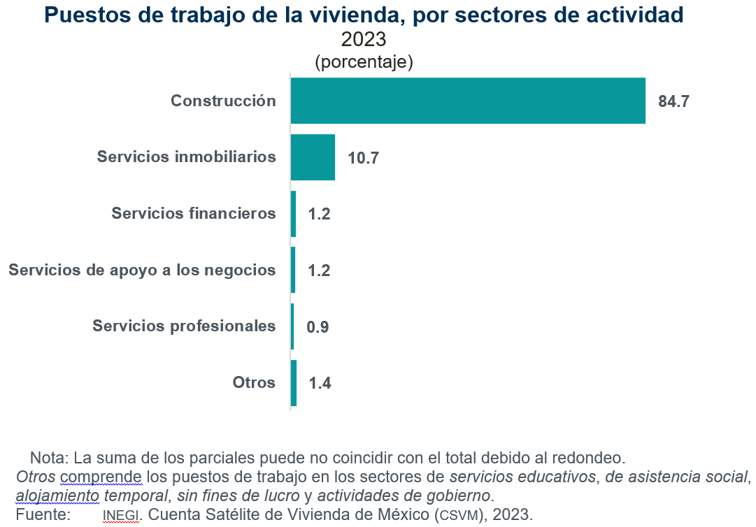 En 2023, las actividades vinculadas con el sector generaron 2 millones 185 mil 532 puestos de trabajo, cantidad que representó 5.4 % del total de puestos de la economía total. De ese total, 84.7 % se generó en el sector de la construcción y 10.7 %, en los servicios inmobiliarios y de alquiler.