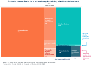 Al considerar la clasificación funcional en materia de vivienda, las actividades que más aportaron a su PIB fueron: autoproducción, que participó con 54.5 %; alquiler efectivo, con 23.6 %, y producción de unidades económicas, con 9.0 por ciento.