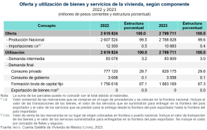 Al considerar el valor del alquiler imputado junto con el sector de la vivienda, en 2023, el PIB total alcanzó un monto de 3 billones 390 mil 959 millones de pesos a precios corrientes. Esta cantidad representó 11.3 % del PIB del total de la economía.