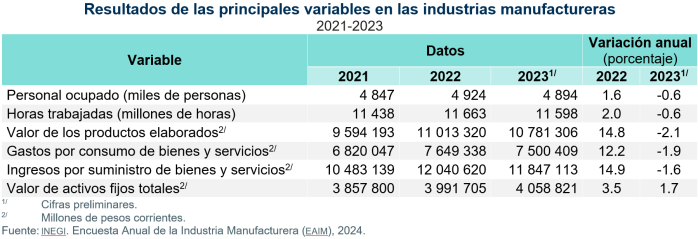 Las estadísticas básicas que produce la EAIM muestran el comportamiento económico de estructura de las principales variables del sector manufacturero del país. Estas sirven como insumo fundamental para la generación de diversos cálculos macroeconómicos, así como de indicadores económicos relacionados con el empleo, la producción y la inversión de la industria manufacturera.