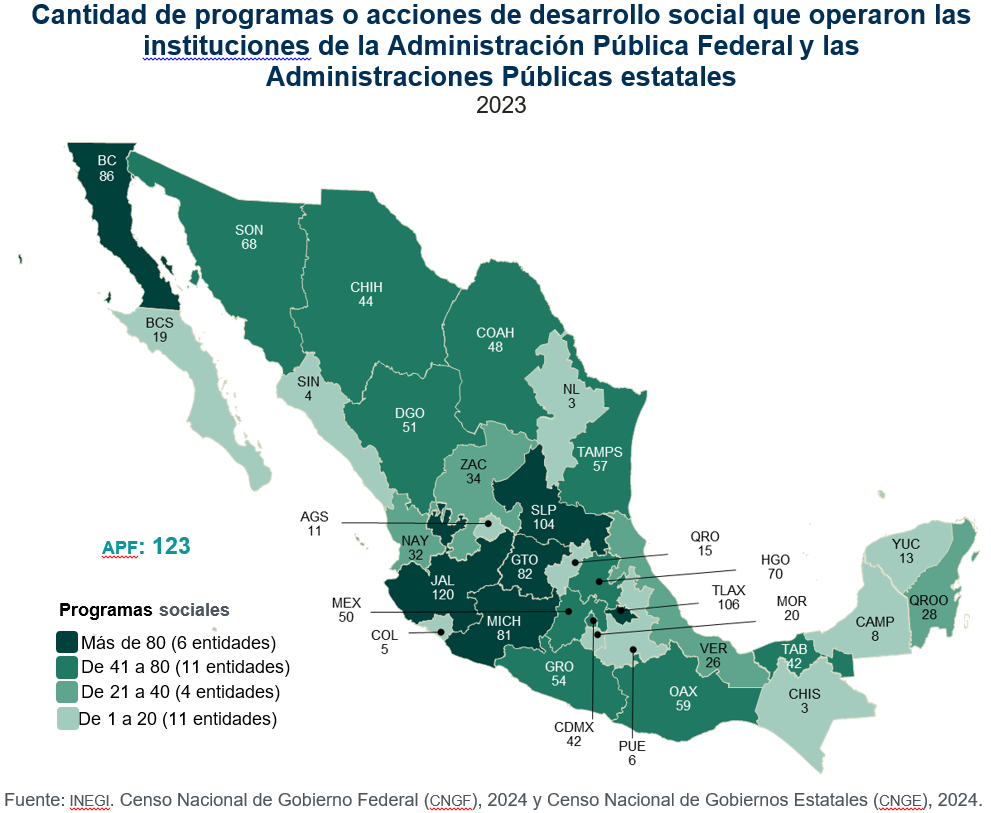 Durante 2023, las instituciones de la administración pública del país operaron mil 514 programas o acciones de desarrollo social (123 en la APF y mil 391 en las APE). En el ámbito estatal Jalisco, Tlaxcala y San Luis Potosí operaron la mayor cantidad, con 109, 106 y 104, respectivamente.