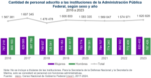 Al cierre de 2023, se reportaron un millón 620 mil 828 personas servidoras públicas adscritas a las instituciones de la APF: 51.0 % correspondió a mujeres y 49.0 %, a hombres. Al comparar con 2022, la cantidad de personal aumentó 2.9 % en 2023.