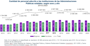 En el mismo periodo, a nivel nacional se reportaron 2 millones 405 mil 272 personas servidoras públicas adscritas a las APE. Del total, 56.3 % correspondió a mujeres y 43.7 %, a hombres. Al comparar con 2022, hubo una disminución de 3.7 % en 2023.