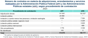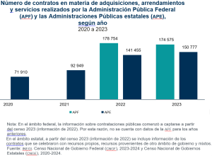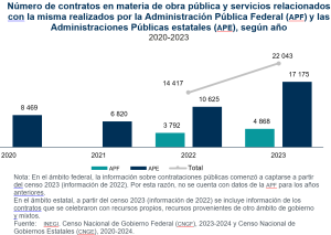 Durante 2023, se realizaron 325 mil 352 contratos en materia de adquisiciones, arrendamientos y servicios con personas proveedoras y/o contratistas: 53.7 % correspondió a la APF y 46.3 %, a las APE. En contraste con 2022, la cifra total aumentó 1.6 % en 2023.