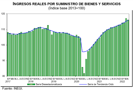 En abril de 2022, a tasa mensual y con cifras desestacionalizadas, los resultados de la Encuesta Mensual sobre Empresas Comerciales (EMEC) indican que, en las empresas comerciales al por mayor, los ingresos reales por suministro de bienes y servicios -monto que obtuvieron las empresas por todas aquellas actividades de producción, comercialización o prestación de servicios que realizaron en el mes de referencia-, disminuyeron 0.9 %, las remuneraciones medias reales pagadas se incrementaron 1 % y el personal ocupado total, 0.1 por ciento.