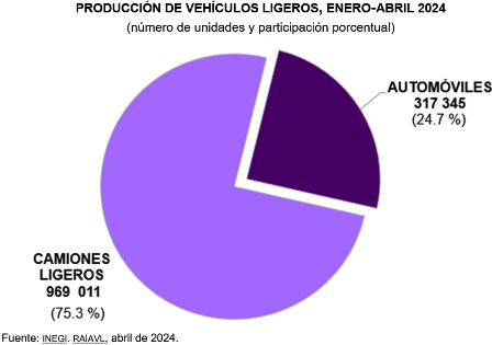Durante enero-abril de 2024, se comercializaron 461 mil 800 vehículos ligeros y, en este mismo periodo, se produjeron un millón 286 mil 356 unidades en México. Los camiones ligeros representaron 75.3 % del total producido, mientras que el resto correspondió a la fabricación de automóviles.