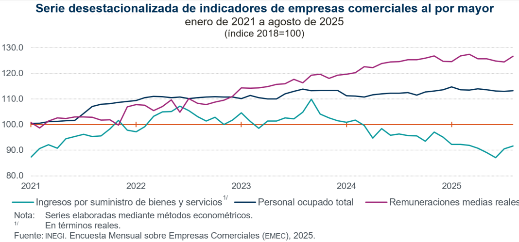 En agosto de 2025, a tasa mensual y con datos desestacionalizados, los ingresos reales por suministro de bienes y servicios (monto que se obtuvo por todas aquellas actividades de producción, comercialización o prestación de servicios) de las empresas comerciales al por mayor incrementaron 1.2 %; el personal ocupado total, 0.2 %, y las remuneraciones medias reales, 1.7 por ciento.