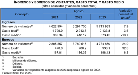 En el octavo mes de 2023, el ingreso de divisas referente al gasto total de visitantes internacionales ascendió a 2 mil 133.8 millones de dólares. En el mismo mes de 2022, el monto fue de 2 mil 213.8 millones y, en agosto de 2021, de mil 799.9 millones de dólares.
