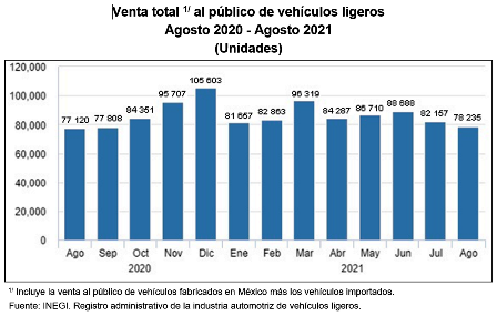 En agosto se vendieron al público en el mercado interno 78 mil 235 unidades. Por su parte, en el periodo enero-agosto de 2021 se comercializaron 680 mil 916 vehículos ligeros.