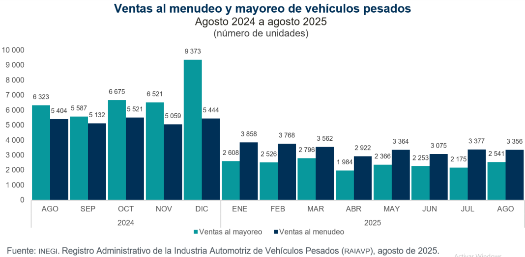 Para los meses de enero a agosto de 2025, se exportaron 82 mil 620 unidades, lo que representó una variación de -25.8 % respecto al mismo lapso de 2024. Estados Unidos fue el principal destino de las exportaciones de vehículos pesados, con 94.8 % del total.