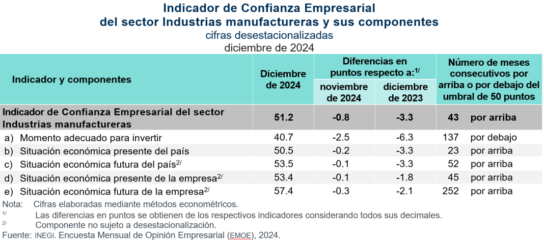 En diciembre de 2024 y con cifras desestacionalizadas, el ICE de Industrias manufactureras fue de 51.2 puntos, 0.8 puntos menos que en noviembre pasado. Con este dato, el indicador se coloca, por 43 meses consecutivos, por arriba del umbral de los 50 puntos. La variación del indicador resultó de caídas en sus cinco componentes.