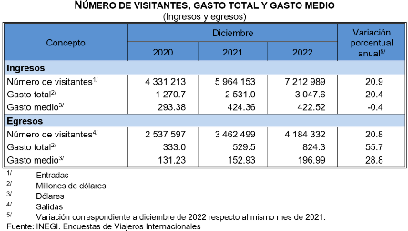 En diciembre de 2022, ingresaron al país 7 millones 212 mil 989 visitantes. De estos, 4 millones 257 mil 176 fueron turistas internacionales (viajeras y viajeros residentes en el extranjero que pernoctan en México).