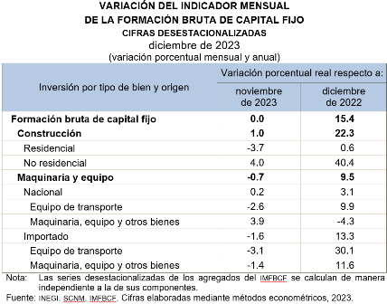 A tasa anual y con series desestacionalizadas, la formación bruta de capital fijo aumentó 15.4 % en términos reales. A su interior, los gastos en construcción ascendieron 22.3 % y en maquinaria y equipo, 9.5 %, en diciembre de 2023.