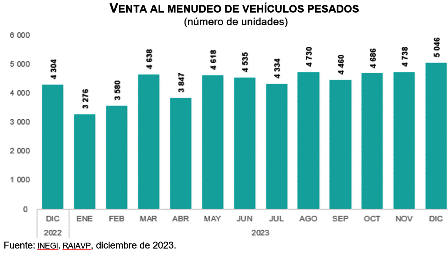 En diciembre de 2023, se vendieron 5 mil 046 vehículos pesados al menudeo y 5 mil 466 al mayoreo en el mercado nacional