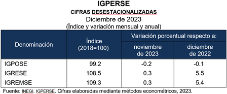 En diciembre de 2023 y con datos ajustados por estacionalidad, el Índice Global de Personal Ocupado de los Sectores Económicos (IGPOSE) registró 99.2 puntos: disminuyó 0.2 % con relación al mes anterior.