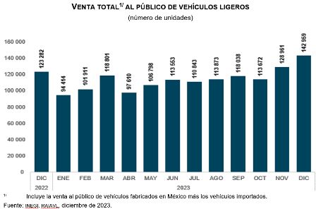 El Instituto Nacional de Estadística y Geografía (INEGI) da a conocer el avance de las ventas al público en el mercado interno, según el Registro Administrativo de la Industria Automotriz de Vehículos Ligeros (RAIAVL), en diciembre de 2023.