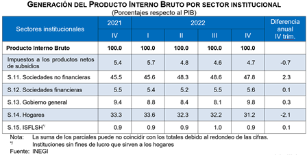 En el cuarto trimestre de 2022, el sector Sociedades no financieras generó 47.8 % del Producto Interno Bruto (PIB); Hogares, 31.2 %; Gobierno general, 9.8 % y Sociedades financieras, 5.6 por ciento. Instituciones sin fines de lucro que sirven a los hogares contribuyó con 0.9 por ciento.