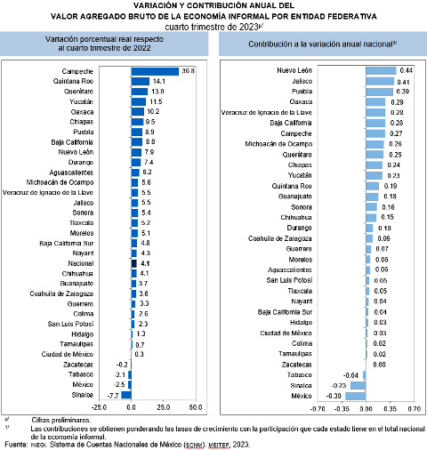 Durante el cuarto trimestre de 2023, el Valor Agregado Bruto (VAB) de la economía informal alcanzó 6 billones 045 mil 566 millones de pesos a precios de 2018, lo que representó un avance real de 4.1 % a tasa anual. Por entidad federativa, los mayores crecimientos se observaron en Campeche, con 36.8 %; Quintana Roo, 14.1 %; Querétaro, 13 %; Yucatán, 11.5 %, y Oaxaca, con 10.2 por ciento.