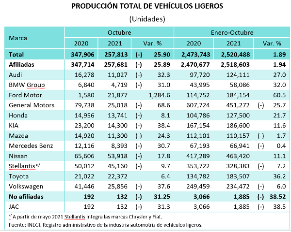La producción total de vehículos ligeros en el periodo enero–octubre de 2021 fue de 2 millones 520 mil 488 unidades