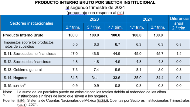 En el segundo trimestre de 2024, el sector Sociedades no financieras generó 45.7% del Producto Interno Bruto (PIB); Hogares, 34.4%; Gobierno general, 8.0% y Sociedades financieras, 4.8 por ciento. Instituciones sin fines de lucro que sirven a los hogares (ISFLSH) aportó 0.8% y el restante 6.3% se conformó de los Impuestos sobre los productos netos de subsidios.