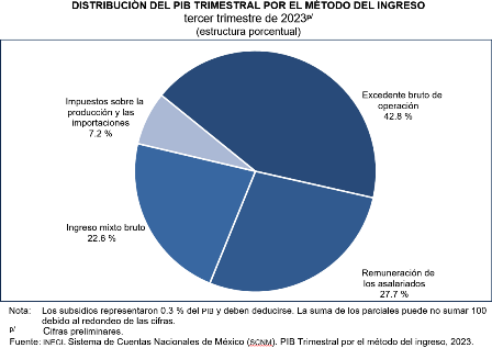 En el trimestre de referencia, los principales componentes del PIB por el método del ingreso contribuyeron así: Excedente bruto de operación aportó 42.8 %; Remuneración de los asalariados, 27.7 %, e Ingreso mixto bruto, 22.6 por ciento.