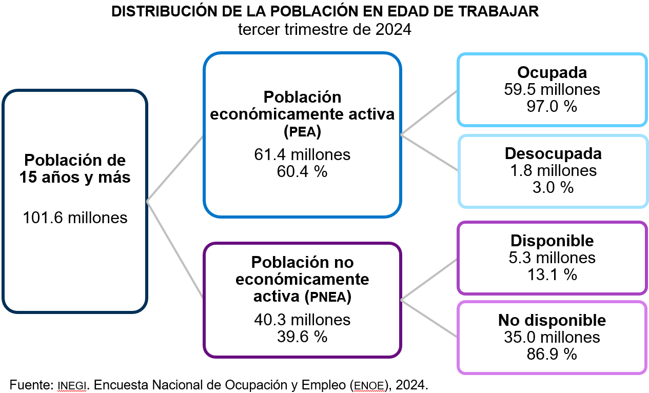 En el trimestre julio-septiembre de 2024, la PEA del país fue de 61.4 millones de personas, 378 mil más que en el tercer trimestre de 2023. Esta representó 60.4 % de la población de 15 años y más.