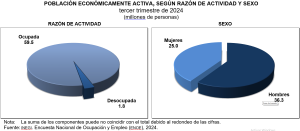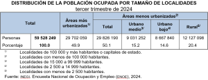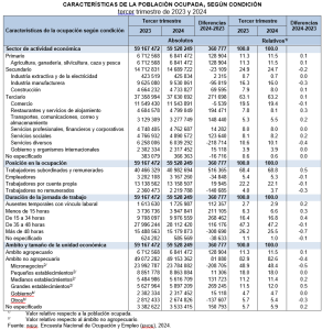 Un total de 59.5 millones de personas se encontraban ocupadas: 361 mil más en relación con el tercer trimestre de 2023. Este cambio se concentró en restaurantes y servicios de alojamiento, con un aumento de 194 mil personas; en transportes, comunicaciones, correo y almacenamiento, con 148 mil; en agricultura, ganadería, silvicultura, caza y pesca, con 129 mil; en servicios sociales, con 124 mil, y en construcción, con 70 mil personas.