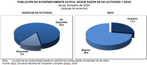 En el trimestre julio septiembre de 2024, la población desocupada fue de 1.8 millones de personas. La tasa de desocupación (TD) correspondiente fue de 3.0 % de la PEA, no presentó cambio respecto al mismo periodo de un año antes.