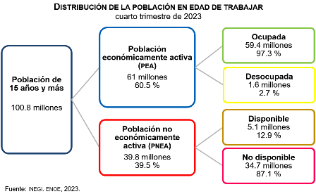 En el trimestre octubre-diciembre de 2023, la población económicamente activa (PEA) del país fue de 61 millones de personas, 898 mil más que en el cuarto trimestre de 2022. La PEA representó 60.5 % de la población de 15 años y más.