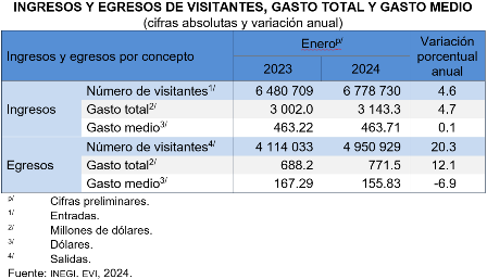 En el primer mes de 2024, el ingreso de divisas por concepto de gasto total de visitantes ascendió a 3 mil 143.3 millones de dólares, monto mayor en 4.7 % con respecto al mismo mes de 2023.