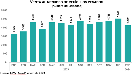 En enero de 2024, las 11 empresas que conforman este registro vendieron 4 mil 290 vehículos pesados al menudeo y 3 mil 754 al mayoreo, en el mercado nacional. Lo anterior representó una variación de 31.0 y de 10.4 %, respectivamente, con base en el mismo mes de 2023.