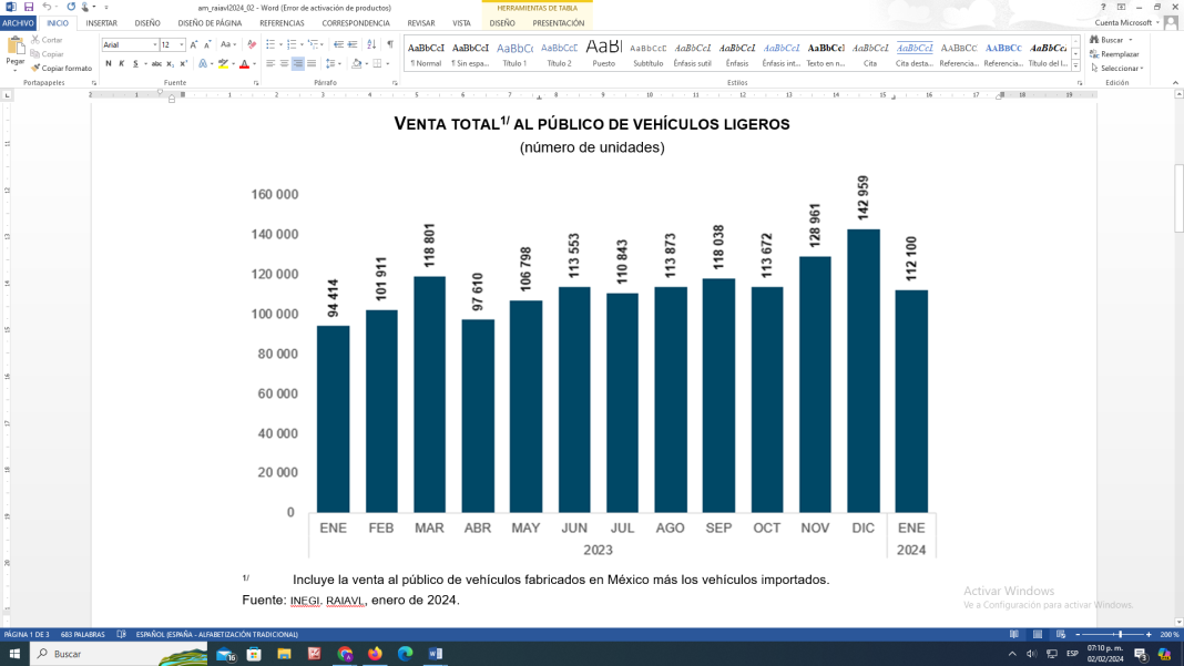 El Instituto Nacional de Estadística y Geografía (INEGI) da a conocer el avance de las ventas al público en el mercado interno, según el Registro Administrativo de la Industria Automotriz de Vehículos Ligeros (RAIAVL), en enero del presente año.