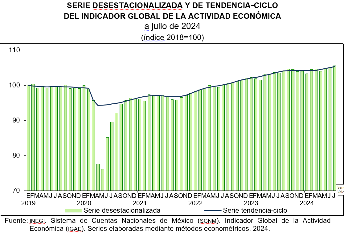 En julio de 2024 y con cifras desestacionalizadas, el IGAE incrementó 0.6 % a tasa mensual.