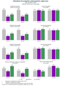 En julio de 2025, la población ocupada en la informalidad laboral fue de 34.1 millones de personas y la tasa de informalidad laboral 1 (TIL1) se estableció en 56.1 % de la población ocupada, porcentaje superior al 54.5 % del séptimo mes de 2024. La TIL1 urbana fue de 45.3 por ciento.