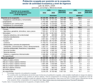 Del total de la población ocupada (60.8 millones), 41.1 millones (67.6 %) operaron como trabajadoras o trabajadores subordinados y remunerados al ocupar una plaza o puesto de trabajo, lo que representó un descenso anual de 256 mil. Además, 13.4 millones (22.0 %) trabajaron de manera independiente o por su cuenta sin contratar empleadas o empleados: 180 mil personas más respecto a julio de 2024. Por su parte, 3.9 millones (6.5 %) fueron personas empleadoras, cifra que subió en 525 mil. Finalmente, 2.4 millones de personas (3.9 %) se desempeñaron en los negocios o en las parcelas familiares, es decir, contribuyeron de manera directa a los procesos productivos, pero sin un acuerdo de remuneración monetaria. Lo anterior significó un aumento anual de 26 mil.