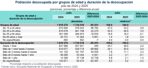 En el mes de referencia, la población desocupada fue de 1.7 millones de personas, una disminución anual de 85 mil. La desocupación de mujeres se ubicó en 685 mil, en julio de 2024, y en 708 mil, en julio de este año. La desocupación de hombres pasó de 1.1 millones, en el séptimo mes de 2024, a un millón, en julio pasado.