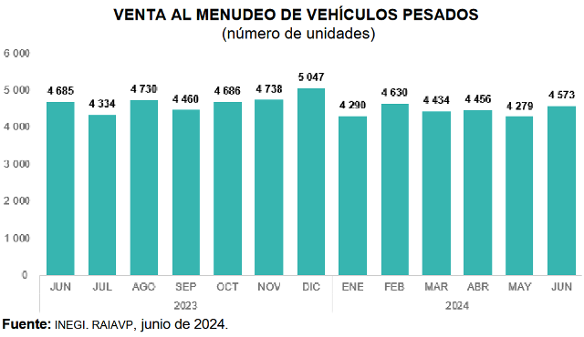 En junio de 2024, las 12 empresas que conforman este registro vendieron 4 mil 573 vehículos pesados al menudeo y 6 mil 784 al mayoreo, en el mercado nacional. Lo anterior representó una variación de -2.4 y de 36.5 %, respectivamente, con base en el mismo mes de 2023.