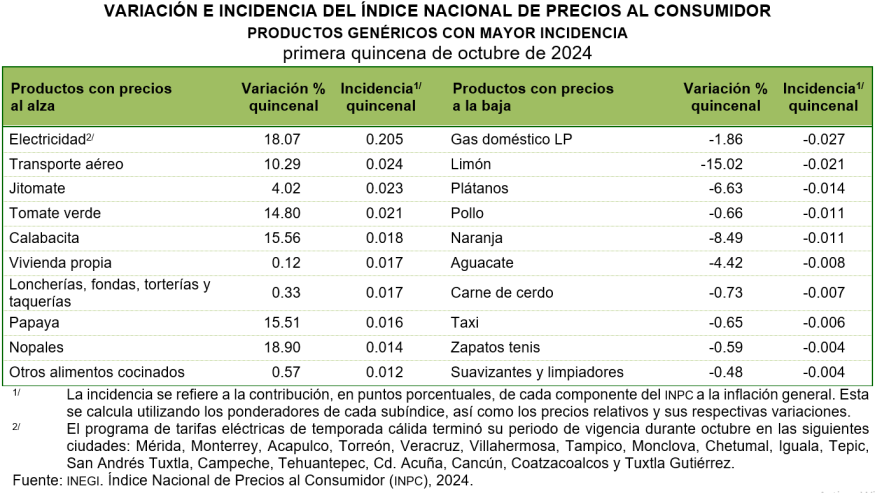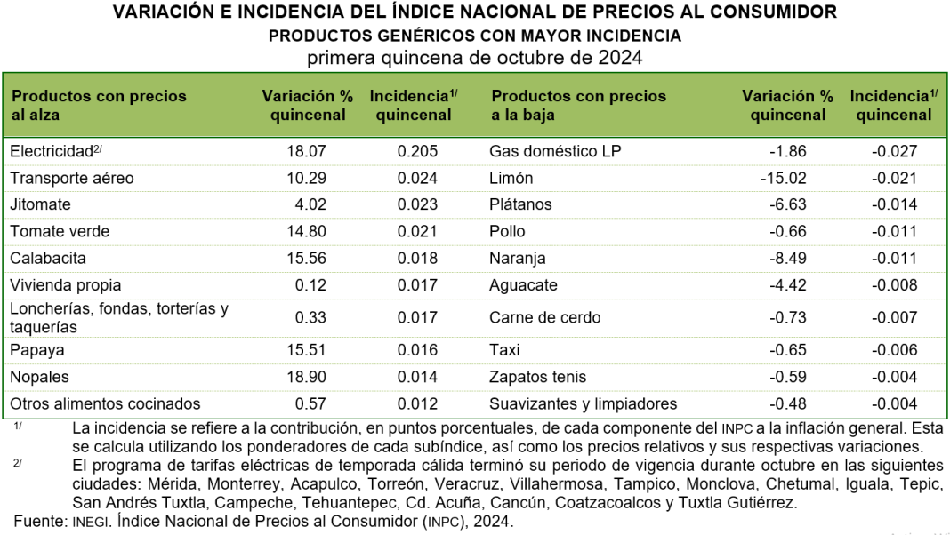 En la primera quincena de octubre de 2024, la variación anual del INPC fue de 4.69 % y la de los índices subyacente y no subyacente de 3.87 y 7.17 %, respectivamente. En el mismo periodo del año anterior, el INPC creció 4.27 % y sus componentes, 5.54 y 0.48 %, en ese orden.