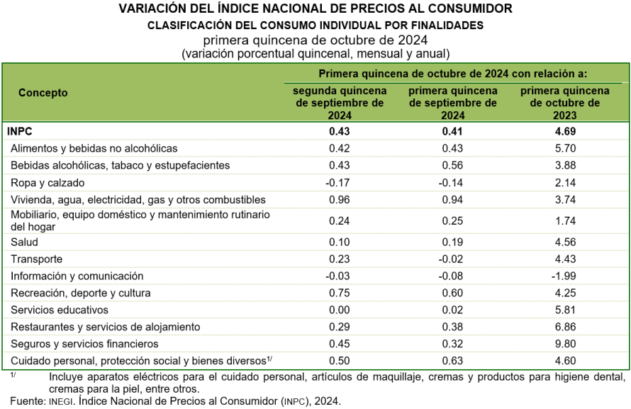 En la primera quincena de octubre de 2024, el INPC incrementó 0.43 % respecto a la quincena previa. En el mismo periodo de 2023, aumentó 0.24 por ciento.