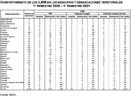 De acuerdo con los ILMM, en el mismo periodo, 33 municipios incrementaron su tasa de la PEA, 956 tuvieron un descenso y 1 469 no presentaron cambios. Asimismo, la tasa de ocupación aumentó en 28 municipios, descendió en 57 y quedó igual en 2 373. Por su parte, la ocupación informal aumentó en 87 municipios, bajó en 122 y no registró cambios en 2 249.