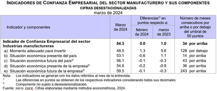 Con cifras originales, el IGOEC —que es el promedio ponderado de los indicadores de los cuatro sectores que lo integran— fue de 54.8 puntos, en marzo de 2024 y representó un alza de 1.2 puntos en relación con el mismo mes de 2023.