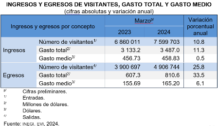 En marzo de 2024, ingresaron al país 7 millones 599 mil 703 visitantes, cifra que representó un incremento de 10.8 % a tasa anual: 4 millones 129 mil 192 fueron turistas internacionales.