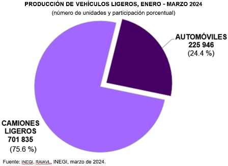 Durante enero-marzo de 2024, se comercializaron 349 mil 752 vehículos ligeros y, en este mismo periodo, se produjeron 927 mil 781 unidades en México. Los camiones ligeros representaron 75.6% del total producido, mientras que el resto correspondió a la fabricación de automóviles.