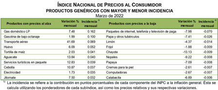 En marzo de 2022, el Índice Nacional de Precios al Consumidor (INPC) presentó una variación de 0.99% respecto al mes anterior. Con este resultado, la inflación general anual se ubicó en 7.45%. En igual mes de 2021, la inflación mensual fue de 0.83% y la anual de 4.67%.