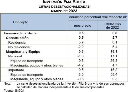 En marzo de 2023, a tasa anual y con series desestacionalizadas, la Inversión Fija Bruta ascendió 8.8 % en términos reales. A su interior, los gastos en Maquinaria y Equipo avanzaron 16.1 % y en Construcción, 2.7 por ciento.