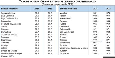 En marzo de 2022, la población ocupada (PO) alcanzó 56.6 millones de personas (97% de la PEA), un aumento anual de 3 millones, ya que en igual mes de 2021 fue de 53.6 millones. Distinguiendo por sexo, la ocupación de hombres fue de 34.1 millones, 1.2 millones más respecto al tercer mes de 2021, y la ocupación de mujeres fue de 22.5 millones, 1.8 millones más que en igual periodo de comparación.