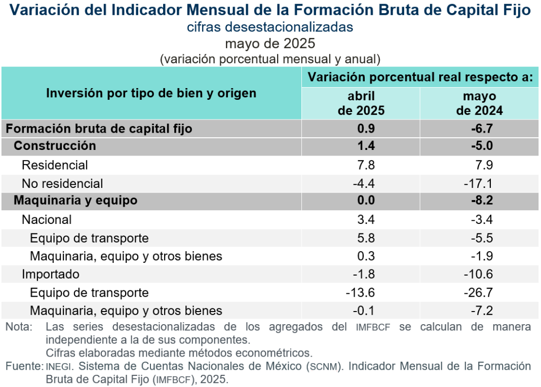 En mayo de 2025 y con cifras desestacionalizadas, la formación bruta de capital fijo incrementó 0.9 % respecto al mes previo, en términos reales. A tasa anual, disminuyó 6.7 por ciento.