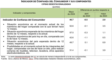 En mayo de 2024 y con datos ajustados por estacionalidad, el Indicador de Confianza del Consumidor (ICC) se situó en 46.7 puntos, lo que significó una disminución mensual de 0.5 puntos.