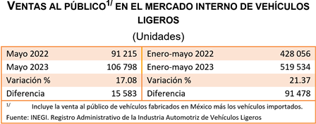 En mayo de 2023, se exportaron 279 274 vehículos ligeros y, durante el periodo enero-mayo de 2023, se reportó un total de 1 273 915 unidades: una variación de 9.2 % respecto al mismo periodo de 2022.